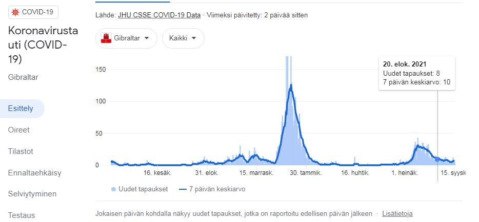 Tässä on Gibraltarin ajankohtainen koronatieto. En minä näe 2500 prosentin nousua. Siinä lukee että tuoreet tartunnat 8kpl. Vai onko tämä illuminaatin väärentämä tilasto?